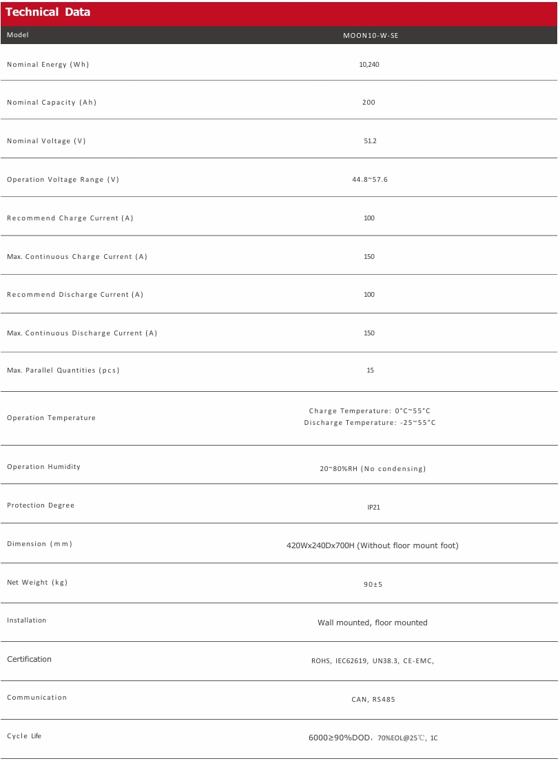 LiFePO4 Solar Battery Pack MOON10-W-SE 51.2V200Ah 10240Wh