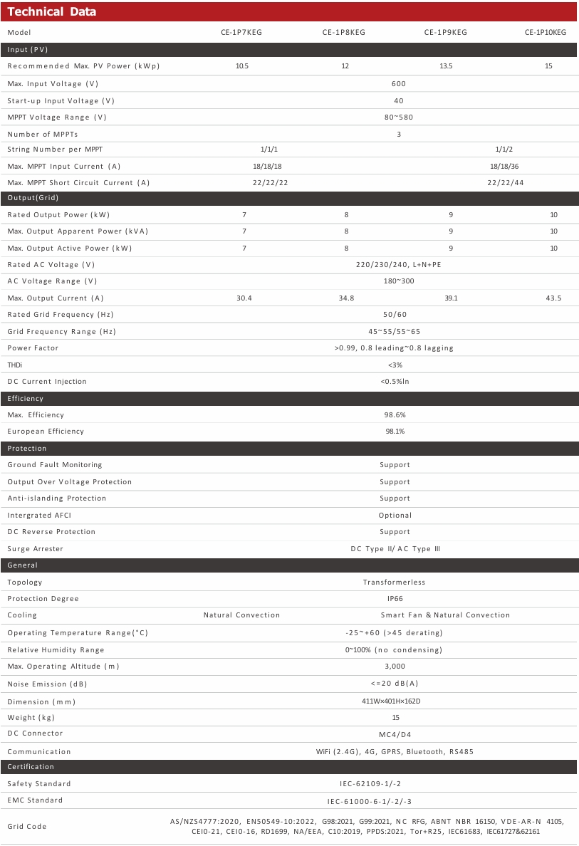 Single Phase On Grid Inverter CE-1P7/8/9/10KEG