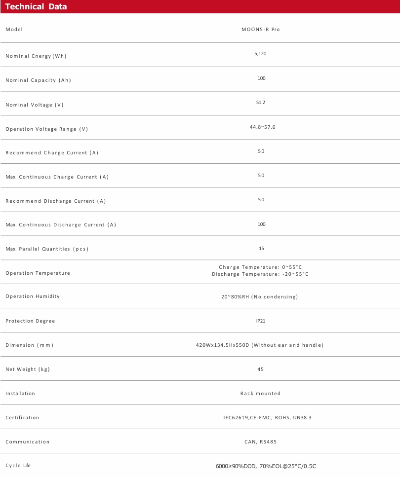 LiFePO4 Solar Battery Pack MOON5-R Pro 51.2V100Ah 5120Wh