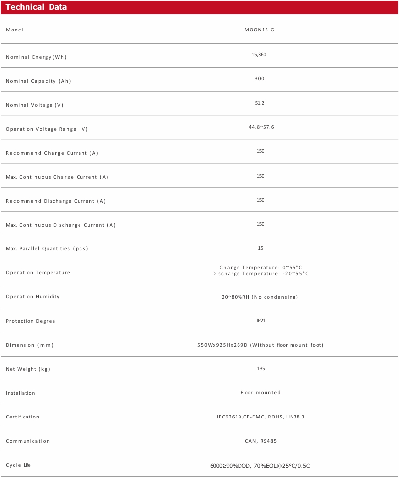 LiFePO4 Solar Battery Pack MOON15-G 51.2V300Ah 15360Wh