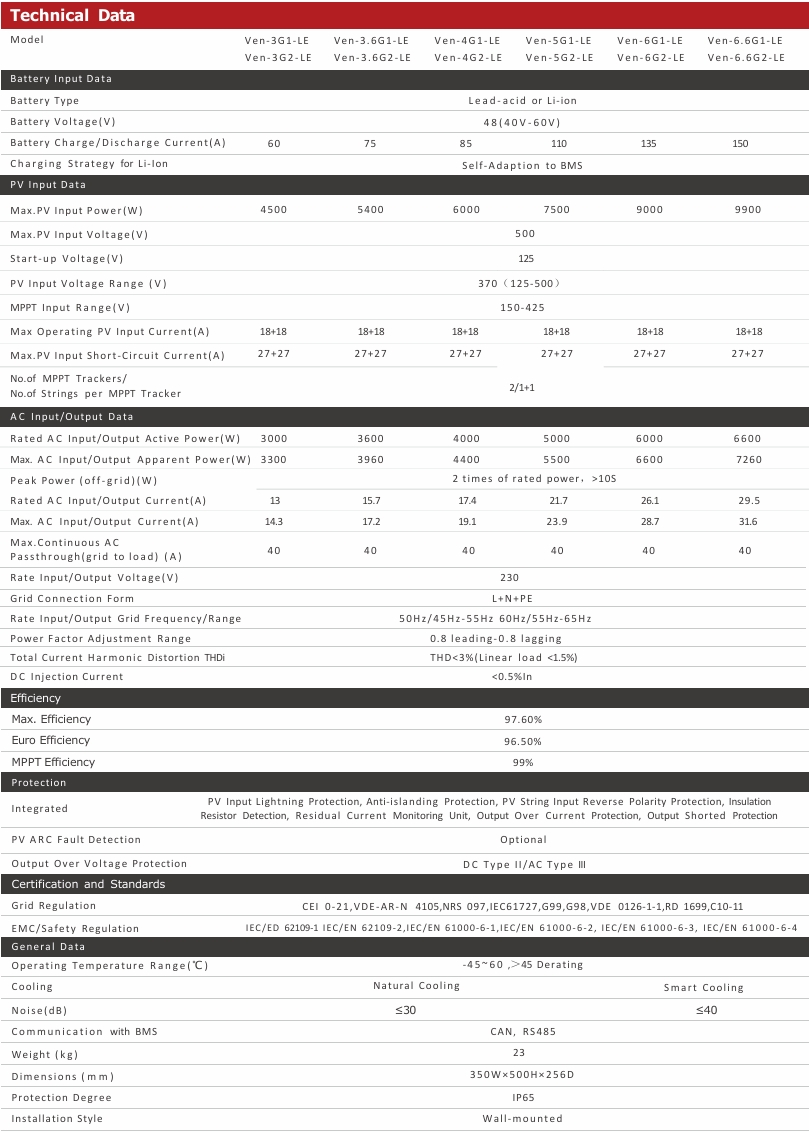 Single Phase Hybrid Inverter Ven-3/3.6/4/5/6/6.6G1-LE Ven-3/3.6/4/5/6/6.6G2-LE