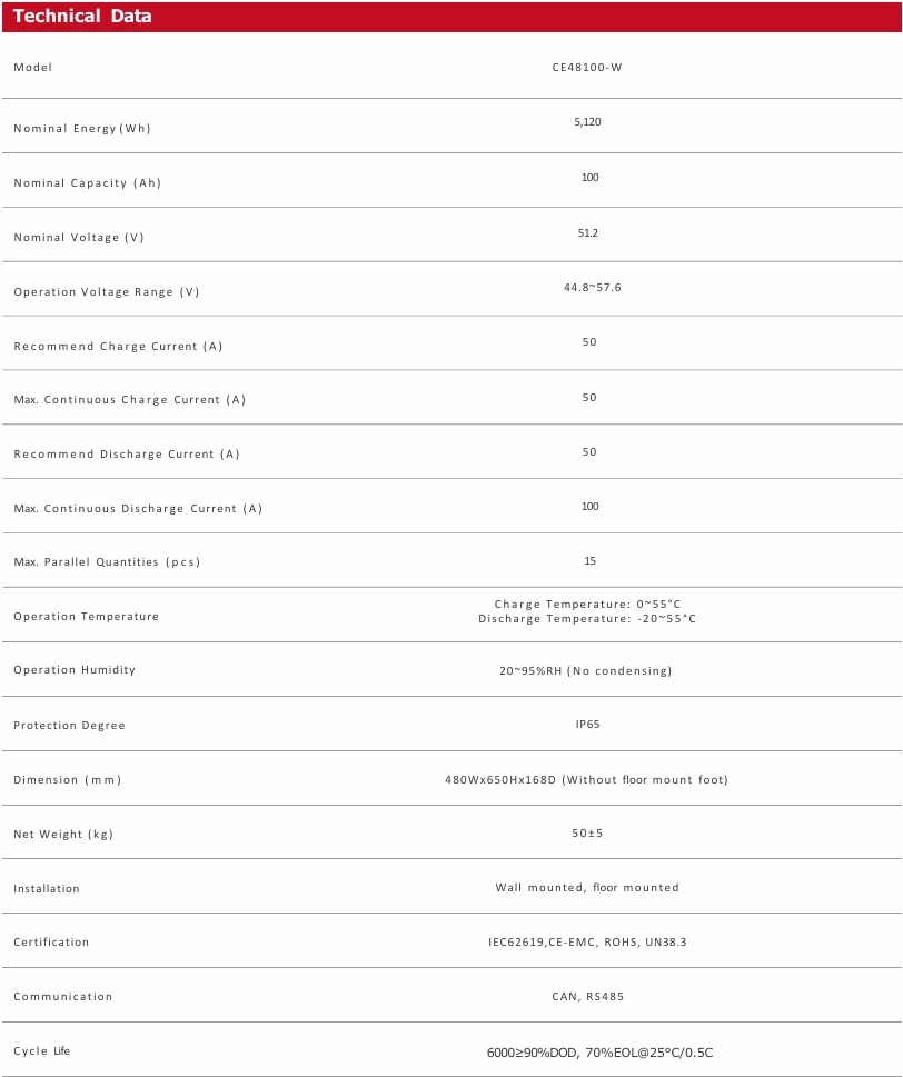 LiFePO4 Solar Battery Pack CE48100-W 51.2V100Ah 5120Wh