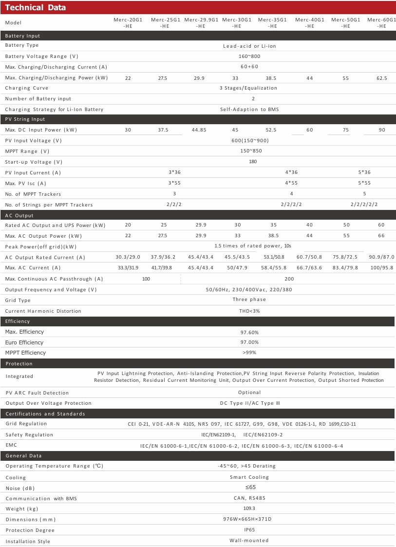 Triple Phase Hybrid Inverter Merc-20/25/29.9/30/35/40/50/60G1-HE